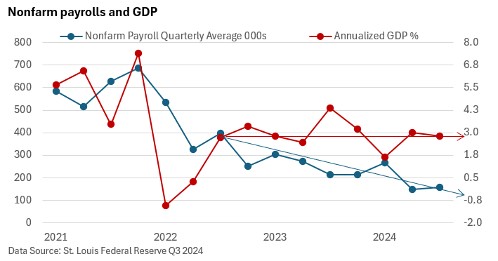 But look what’s happened since the 3rd quarter of 2022. GDP has been steady and solid, averaging an increase of 2.9% per quarter. Soft economic landing? Hardly. But job growth has slowed.