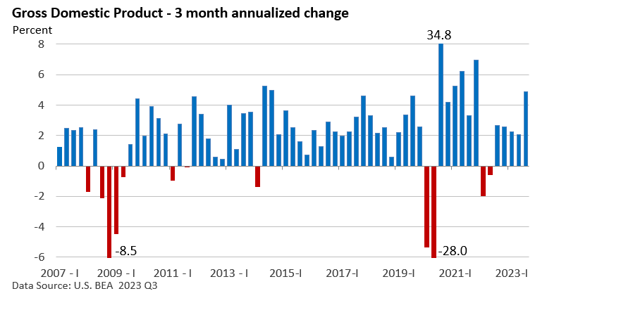 The U.S. Bureau of Economic Analysis (BEA) reported last week that Gross Domestic Product (GDP), which is the largest measure of goods and services for the economy, expanded at an annual pace of 4.9% in the third quarter.