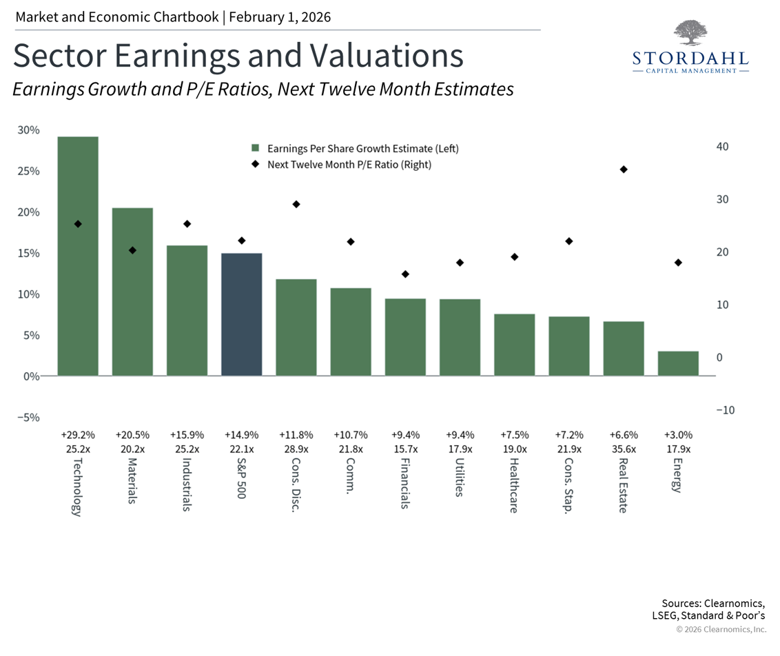 Another way to understand earnings and valuations is to calculate how much they each contributed to stock market returns in 2025. The price of the S&P 500 index rose 16.4% last year, so if earnings-per-share did grow 13% over the full year, then it was by far the largest driver of growth. Specifically, earnings contributed to 80% of the price return whereas the increase in valuations contributed about 20%.