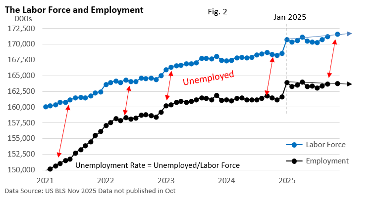 Since the number of unemployed is up since the beginning of the year—see Figure 2, the unemployment rate has risen from 4.0% in January to 4.6% in November.