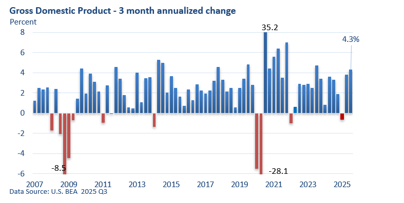GDP expanded at a 4.3% annualized rate in the third quarter, the fastest pace in two years, according to the US Bureau of Economic Analysis.