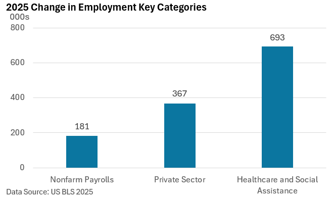 Notably, the engine of job growth is the healthcare sector, which added 693,000 jobs last year. Outside of healthcare, private sector employment declined.