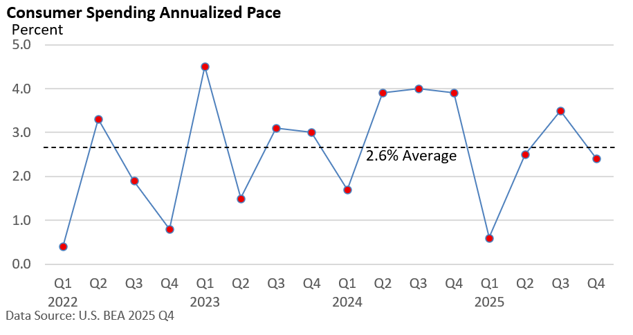Consumer spending rose at an annualized rate of 2.4% in Q4 and is near the four-year average of 2.6%, according to US BEA data. In addition, business spending and investment continue to rise, partly driven by massive outlays for AI data centers.