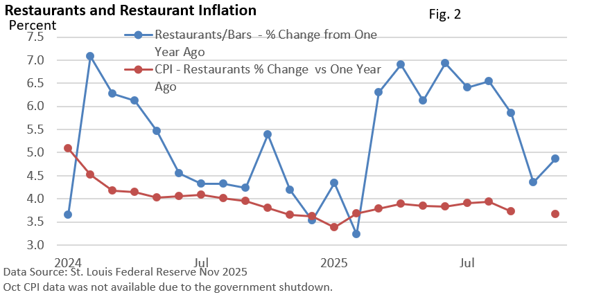 Figure 2 attempts to adjust for inflation by comparing the annual change in sales at restaurants with the annual change in the CPI for eating out. Given that adjustment, sales are outpacing inflation in all but two months.