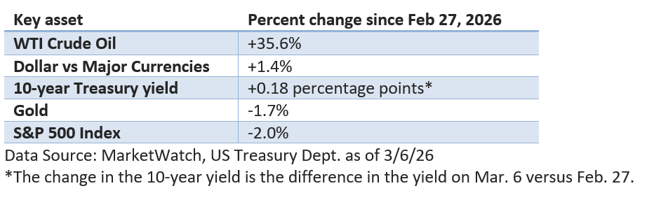 Investors are viewing the war through an economic lens, and the unknowns make it difficult to fully price into equities. For example, how long will hostilities last? And what will happen to oil prices since the Strait of Hormuz—a key conduit for global oil—is closed?