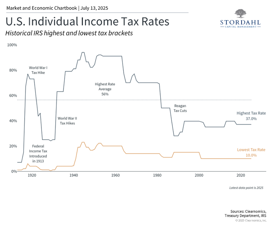 On an individual level, taxes directly affect many aspects of financial planning, and the specific provisions in this tax bill have immediate implications for household finances. From an economic perspective, many investors also worry about the level of government spending, the growing national debt, and other factors that have weighed on markets over the past two decades.